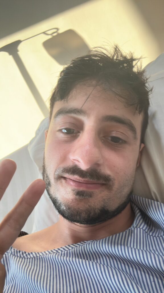 Giorno dopo giorno la situazione della gamba inizia a migliorare. Riacquisisco un po’ di mobilità alle dita dei piedi, il colorito migliora. Per la prima volta riesco a sollevare la gamba con le mani e a sedermi a bordo letto. Gli infermieri ne approfittano per lavarmi e cambiare le lenzuola. Mi faccio portare una bacinella e un rasoio per radermi la barba. Questo piccolo gesto di self-care mi aiuta a cambiare prospettiva.