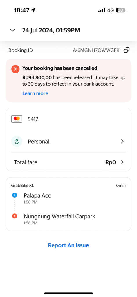 Che la corsa fosse o meno cancellata restava comunque il fatto che un conducente ufficiale di Grab mi aveva abbandonato. L’applicazione ha il dovere di vigilare sul rispetto delle regole da parte dei propri conducenti, regole che in questo caso sono state violate tre volte: nel forzarmi a cancellare la corsa, nel violare le norme di sicurezza stradale e nell’abbandonarmi senza prestare soccorso.