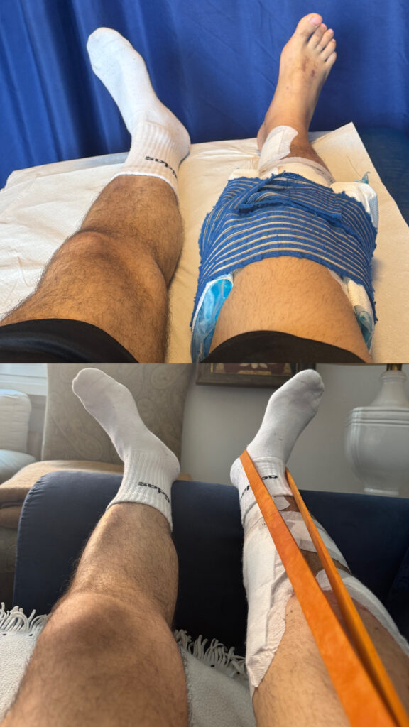 Soon, however, more disappointments arrive. Even with daily physiotherapy I can’t push my knee beyond 60–70° of flexion. The surgical wound doesn’t close: it keeps leaking fluid, becomes more and more irregular, until it eventually turns into a fistula.