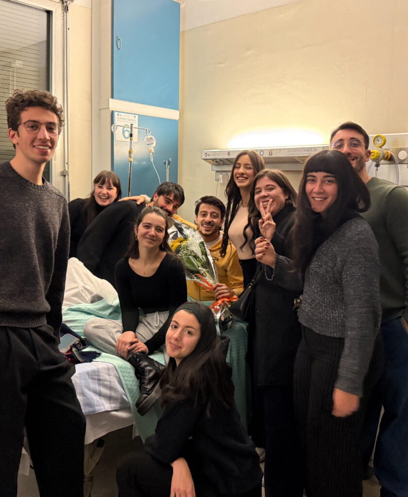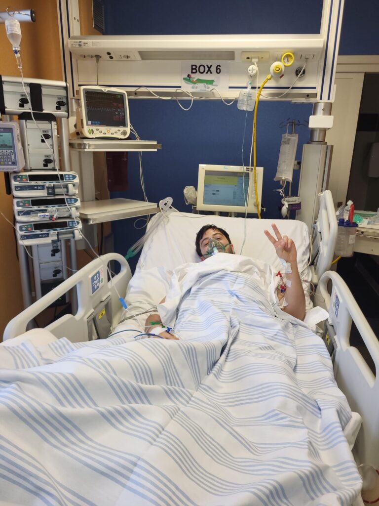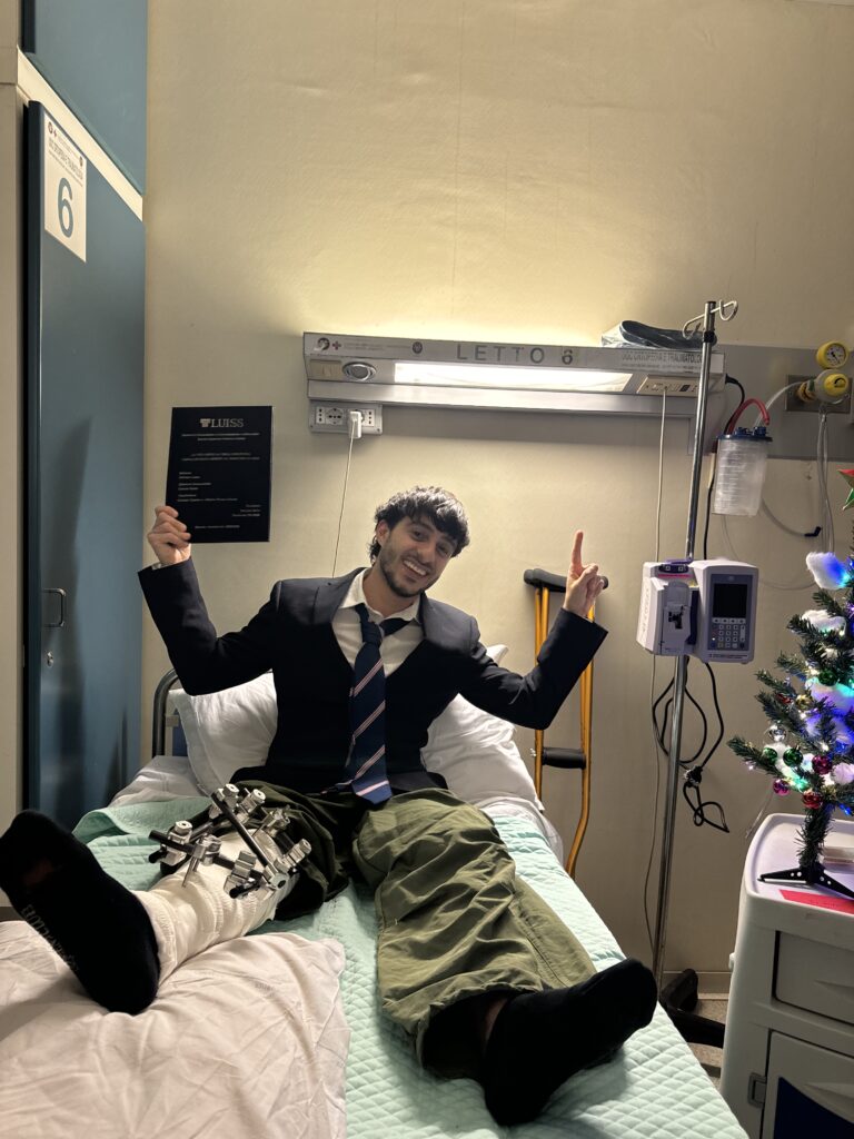 Until the very last moment I hope to defend my thesis in person, but they can’t discharge me in time. The remote ceremony feels a lot like the days of Covid: jacket and tie above, oversized Adidas pants below, to fit around the external fixator. I don’t have a laurel wreath, but my friend Martina places a virtual one on my head in a photo. That weekend there are supposed to be celebrations with all my classmates. On Friday afternoon my backpack is already packed, ready to leave, when the final twist arrives.